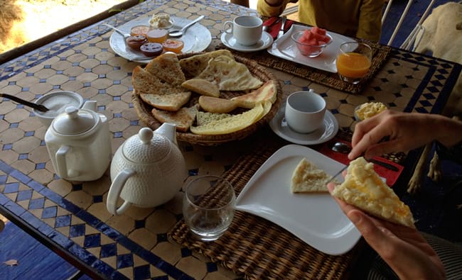 Una colazione a base di sapori marocchini (biscotti, pancake, marmellate e dolci, formaggi freschi, uova di fattoria ecc.) incluso nel prezzo della camera, viene servita tutti i giorni nel giardino o terrazza con vista panoramica sulla campagna di Asilah (Marocco).
